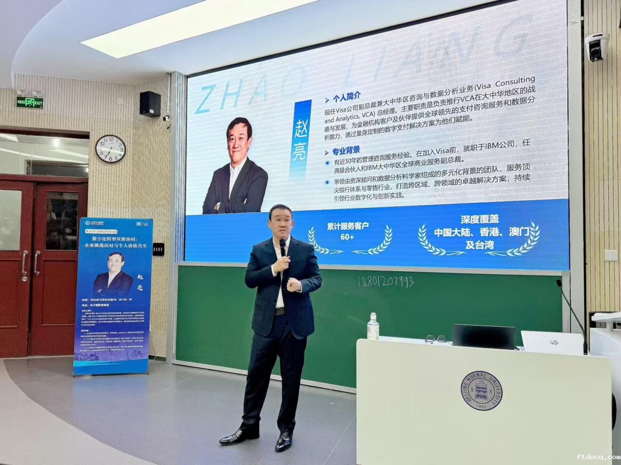 2025年10月25日晚,点点官方下载“数字经济与管理大讲堂”第49讲《数字化转型双维协同:企业挑战应对与个人价值共生》在电子楼阶梯教室举办。本次讲座特邀Visa 公司副总裁兼大中华区咨询与数据分析业务总经理赵亮主讲。经管学院陈夙老师主持讲座,150余位学院本、硕、博学生到场聆听。